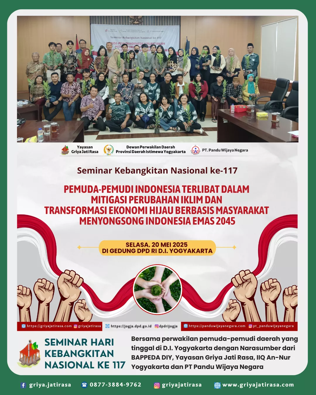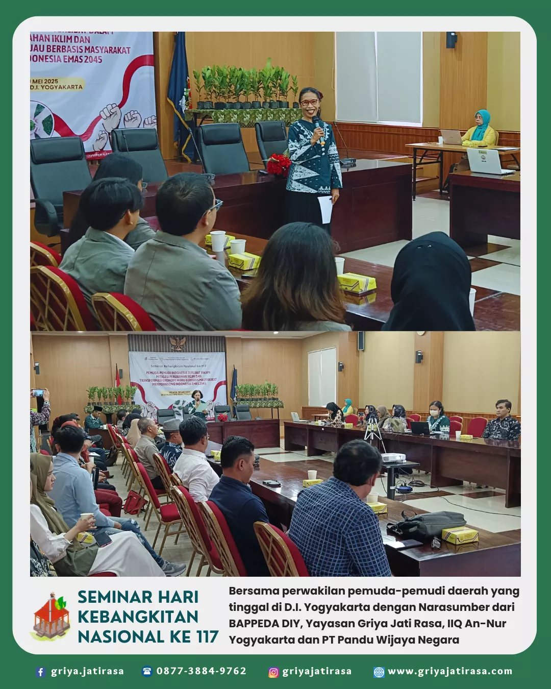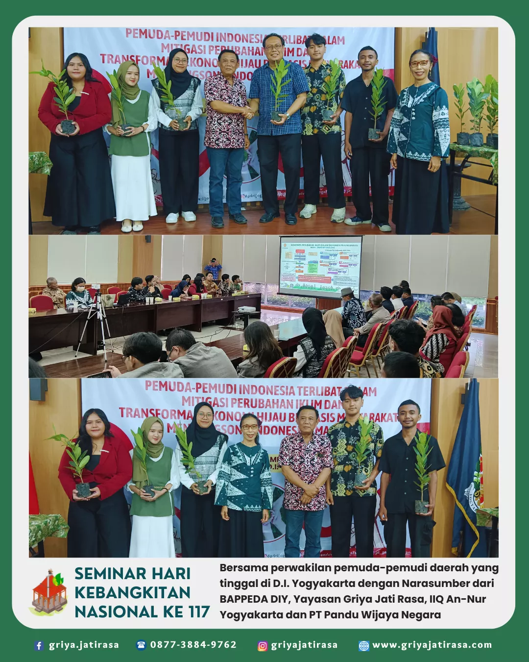Seminar dibuka dengan keynote speech GKR Hemas, Wakil Ketua DPD RI yang menekankan perubahan iklim bukanlah isu masa depan melainkan realitas hari ini, karena itu peran pemuda Indonesia sangat penting sesuai dengan survey dari Youth and Climate Network Indonesia tahun 2023, yang menunjukan 70% anak muda Indonesia memiliki kepedulian tinggi terhadap isu perubahan iklim namun masih terbatas akses dan kapasitas untuk berkontribusi aktif dalam aksi-aksi nyata. Karena itu melalui kegiatan seminar ini pemuda dari daerah-daerah yang bermukim di D.I. Yogyakarta mendapat pengetahuan dan ispirasi bagaimana bisa berkolaborasi dengan Yayasan Griya Jati Rasa, pihak pemerintah, swasta untuk bersama-sama melakukan mitigasi perubahan iklim dan transformasi ekonomi hijau. Transformasi ekonomi hijau tidak hanya soal teknologi energi terbarukan tetapi juga tentang perubahan paradigma dari ekonomi yang eksploitatif ke ekonomi yang regeneratif dan insklusif. Model ini mengedepankan prinsip keadilan ekologis, sosial dan antar generasi.
